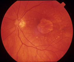 Nervehead is to the left. Numerous cream-colored drusen within the macular and peimacular retina |
