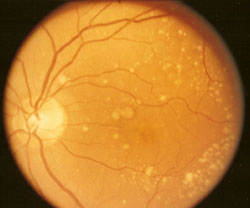 At the early stage drusen cause little or no visual disability. If regression is not forthcoming by dietary means, the drusen, over a period of many years, cause degeneration (atrophy/death) to the adjacent retinal cells. (see below) At that point flat foci of atrophy become apparent within the macula, and when the degeneration has reached an advanced degree, the foci have a white appearance. These degeneration specks tend to enlarge over time, and when the precise center of the macula becomes involved, visual acuity can decrease to a profound degree.